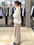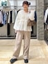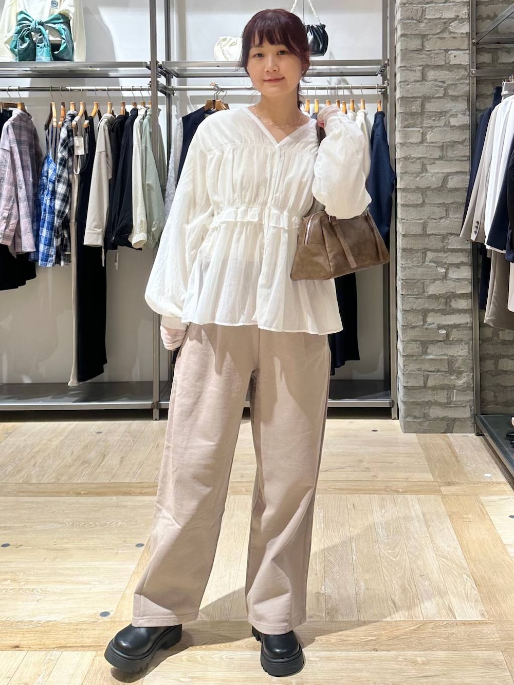 淡色カラー好きママのカジュアルコーデ 甘めなフリルブラウスに カジュアルにスウェットパンツを合わせて 子供と公園でも全力で遊べる カジュアルコーデに