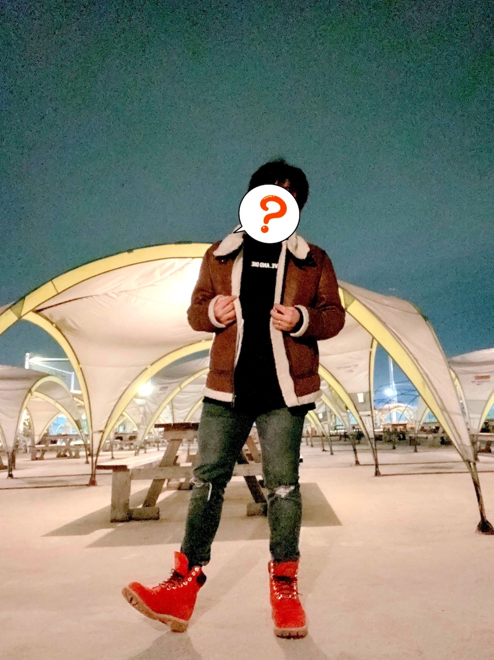 ダメージジーンズと赤いブーツでタイトに! 上は一年前の服だけど、今トレンドみたいなので引っ張り出してきた^_^ 肌寒い夜にサラッと出かけるときにいいですよ!