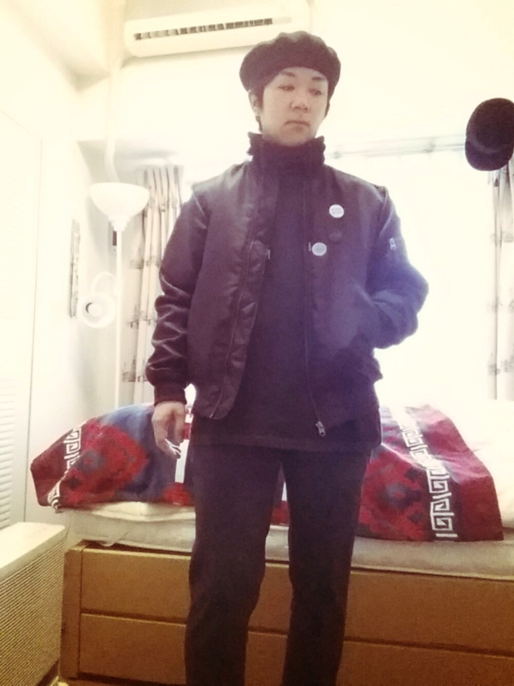 ハイネックは使えますね!ストール、スヌードいらずです。 着るもの全てネイビー×黒(笑)ぼくの安心する色ですね。 MA-1は藍坊主ツアーグッズのバッジとティム・バートン展のピンズ。カスタムしてみました。 ベレー帽:BEAMS MA-1:スピンズ ハイネックスウェット:H&M 半袖スウェット:ズッカ スラックス:ZARA ソックス:ズッカ