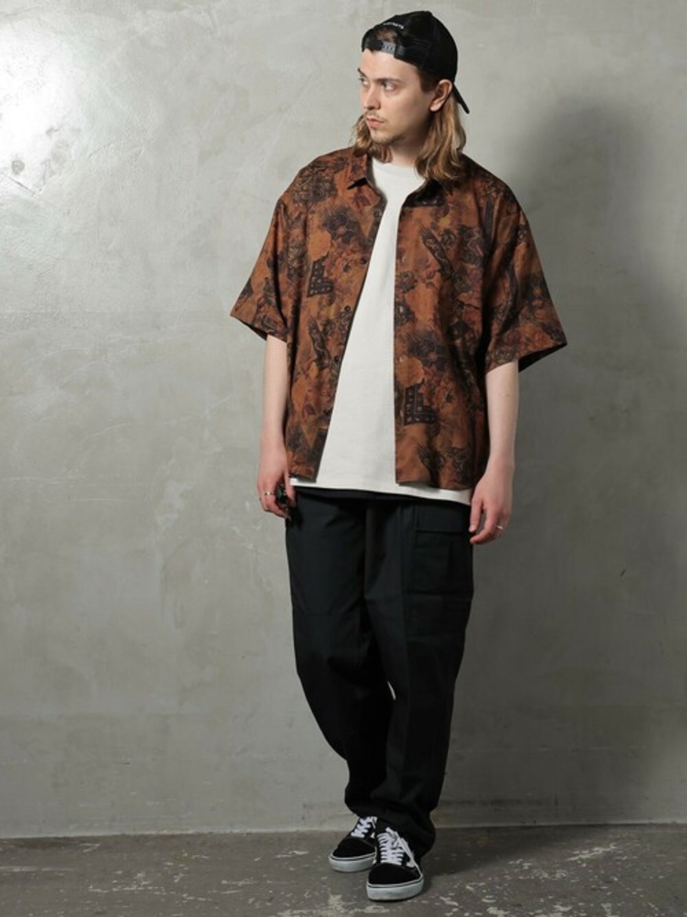 オリジナルのレトロ柄プリントがはえる仕上がりを魅せるシャツは特殊ジョーゼットを使用。 高級感のある生地面の「シワ模様」は、強く撚った2種類の糸を組み合わせることで生まれる特別な風合いと特殊プリントの柄の表現が見事にマッチしたシャツ。