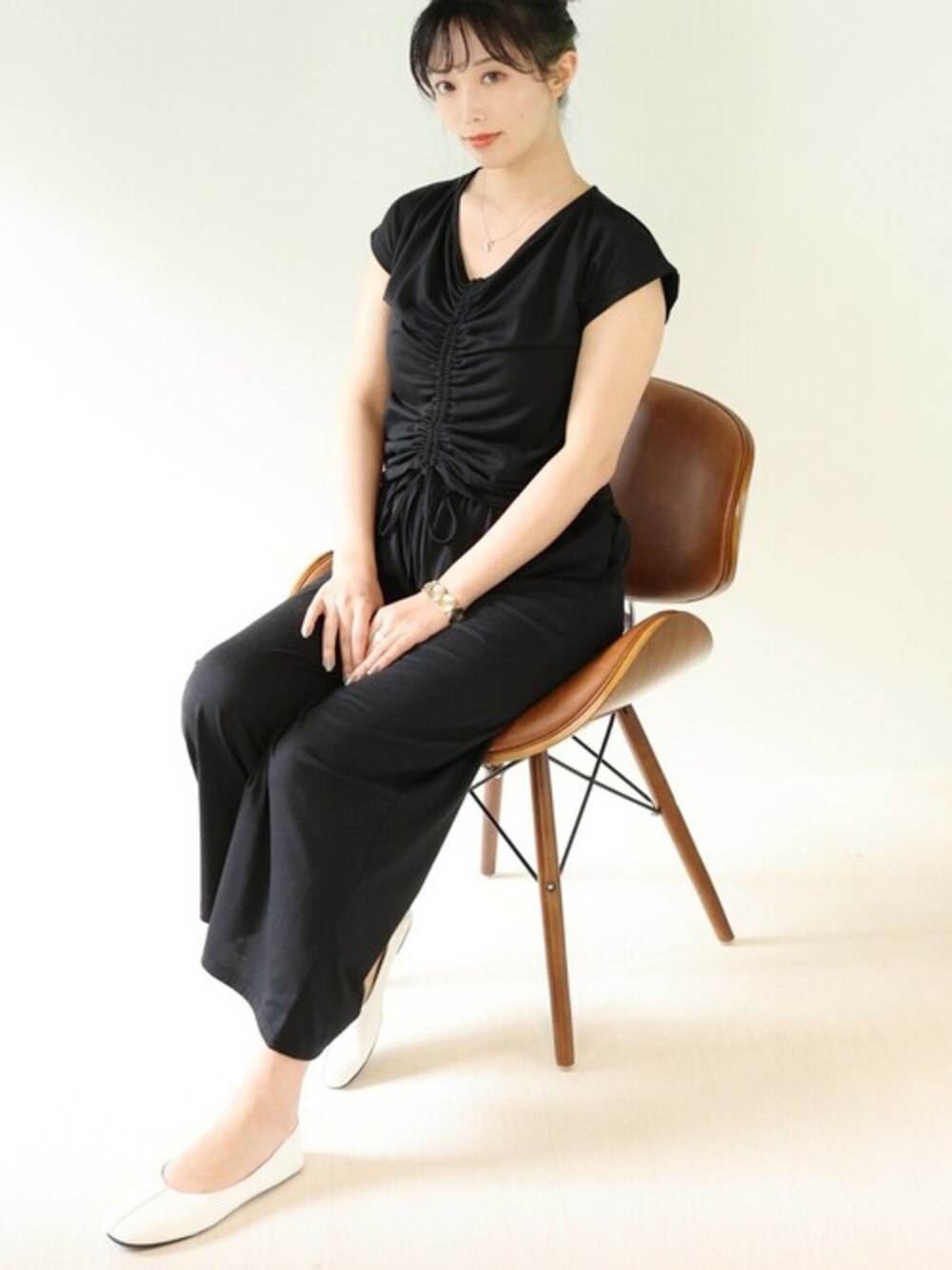 身体にフィットするフロントギャザートップスとゆったりルーズなワイドパンツでメリハリがつくセットアップ。 ゆったりシルエットとのセットアップ、柔らかくリラックス感のある素材は季節の変わり目にぴったりで、ストレスフリーな着心地。 別々に着られるのでコーデの幅がもがります。パンツのウエストがゴムでストレスフリーに穿けて、トップスはコンパクトなサイズ感にVネックなのでスッキリ見せれます。 ルームウエアとしても着れるアイテム。