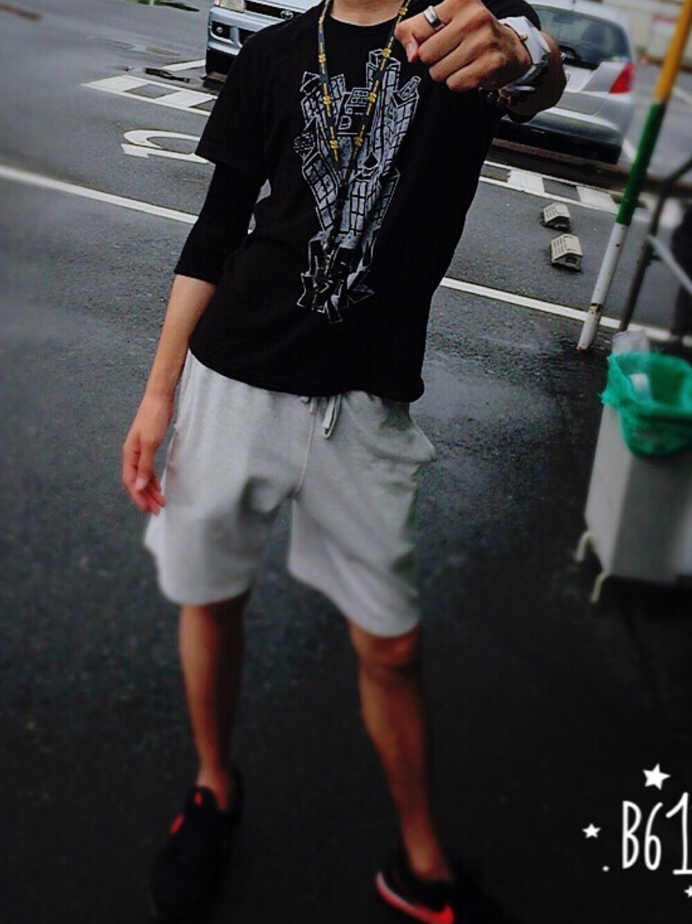 ホワイト系のその他パンツ、ブラック系のTシャツ/カットソー、ブラック系のスニーカーを着用したメンズの夏コーディネートの1枚目の写真
