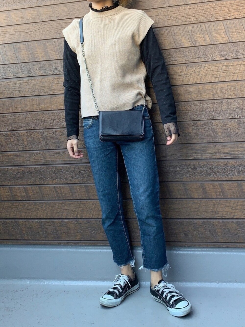 ニットベストとシースルーインナーはセールで買ったから靴まで含めて1万円コーデ💰