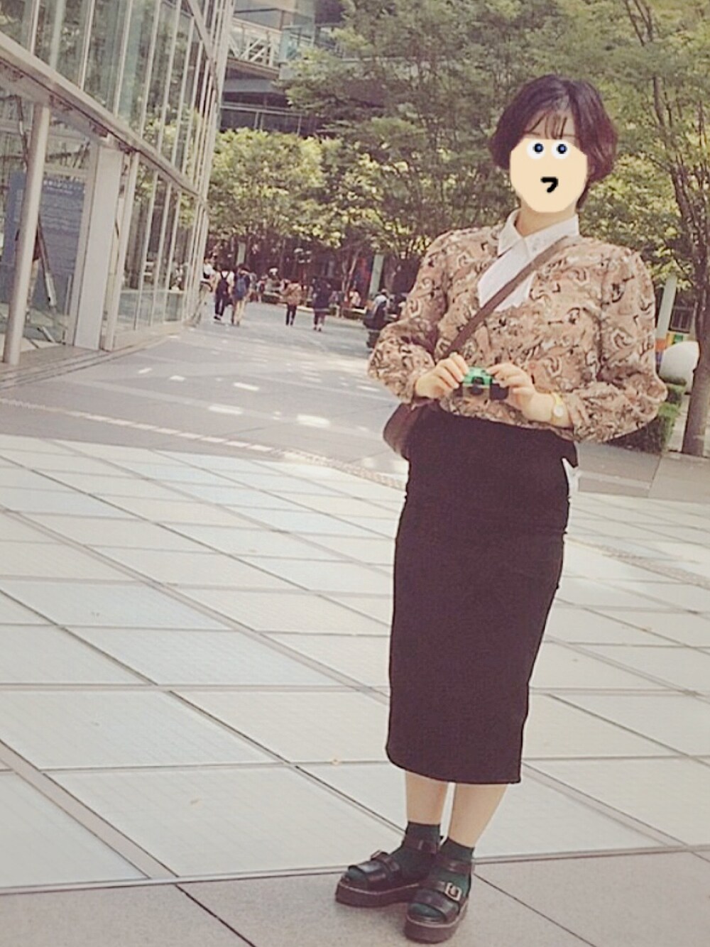来世は必ずや イケボのおじさん(38歳)と共に籍を入れたいな、と存ずるこちら大学生(糸目) 行きつけの古着屋さんで買ったブラウスとタイトスカート.身長がバリ高い(一応はコンプレックス)ため、この丈感のタイトスカート、しかも黒に出会えたのはナイスすぎた.(そしてポイントはアダムエロペ)20000年も探した甲斐があったな… ペイズリー柄のブラウスは首元に何やらベートーベン等の音楽家を思い起こすようなシャバシャバの付録つき.洋風な柄モノだけど色味が桜色とか抹茶色があしらわれているので、ちとだけ和風に着れるオモロいやつ. 出掛けるためにロフトで買った使い捨てカメラは、限りある枚数を慎重に丁寧にと撮っていたので3枚しか撮りませんでした.思い出、写らなインです. ≪menu≫ 柄ブラウス:古着 黒タイトスカート:古着 カバン:ママンのお下がりだワン 厚底カマボコ:驚愕アベイル 靴下:99円お色はモリゾー色