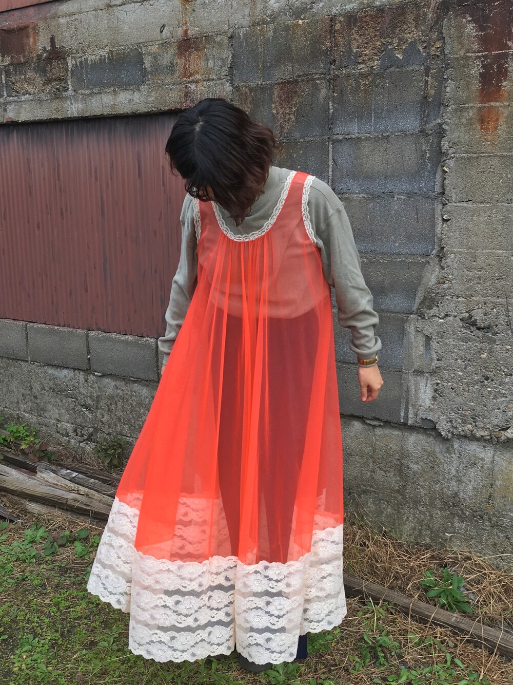 タンスの肥やしになってしまってはまずい…と、”見えない夜の月の代わりに引っ張ってきた【青い君】”のように引っ張って出してきた、赤ピンクのネグリジェ.ちなみに上の歌詞はサカナクションのルーキーより. 166センチという進撃の高身長が着ても足首が隠れる丈感と、回転寿司の特急レーンくらい長いレースが付いているのがお気に入り. 今はこれを着て外に出てるけれど、いつかはこれをナイトドレスとして着用、睡眠、それが死ぬほど似合うような女になりたい.レッツ女磨き. 普段は母親系レトロ古着やらヨーロッパヴィンテージを着てるので、こういう系統はほとんど着ません.だけどたまに着ました.自分の好きな服装とか格好とか、たまに迷走して分からなくなるので、こうやって自分の好きなものをただ無心で身につけてみます. う〜〜ん、とりあえずだけれど、どちらかというと自分は、洋服は着ないより着たい派です.ホモ・サピエンス南無.