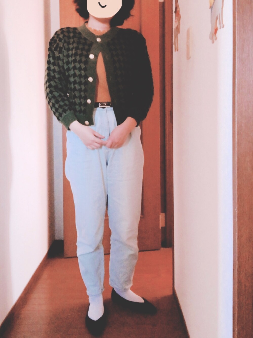 グリーン系のニット/セーター、オレンジ系のTシャツ/カットソー、ブルー系のデニムパンツを着用したレディースの冬コーディネートの1枚目の写真
