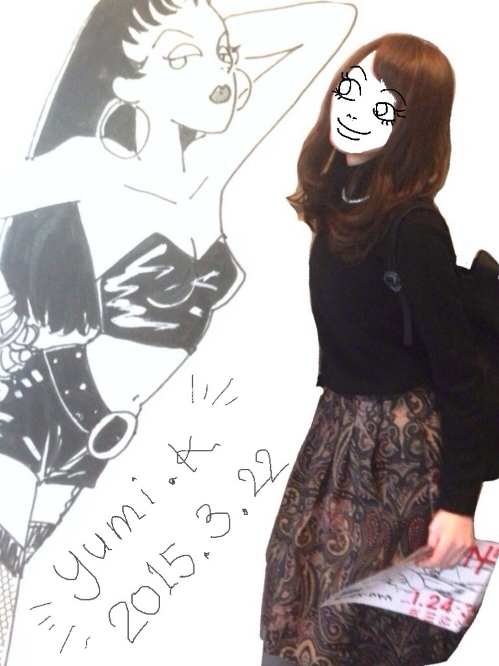 flowerの古着スカートのヴィンテージっぽい柄がお気に入り。パールネックレスに合わせたパールのお花イヤリングはハンドメイドのものを購入。 岡崎京子展いってきました。 サカエちゃんのパネルと写真撮影!