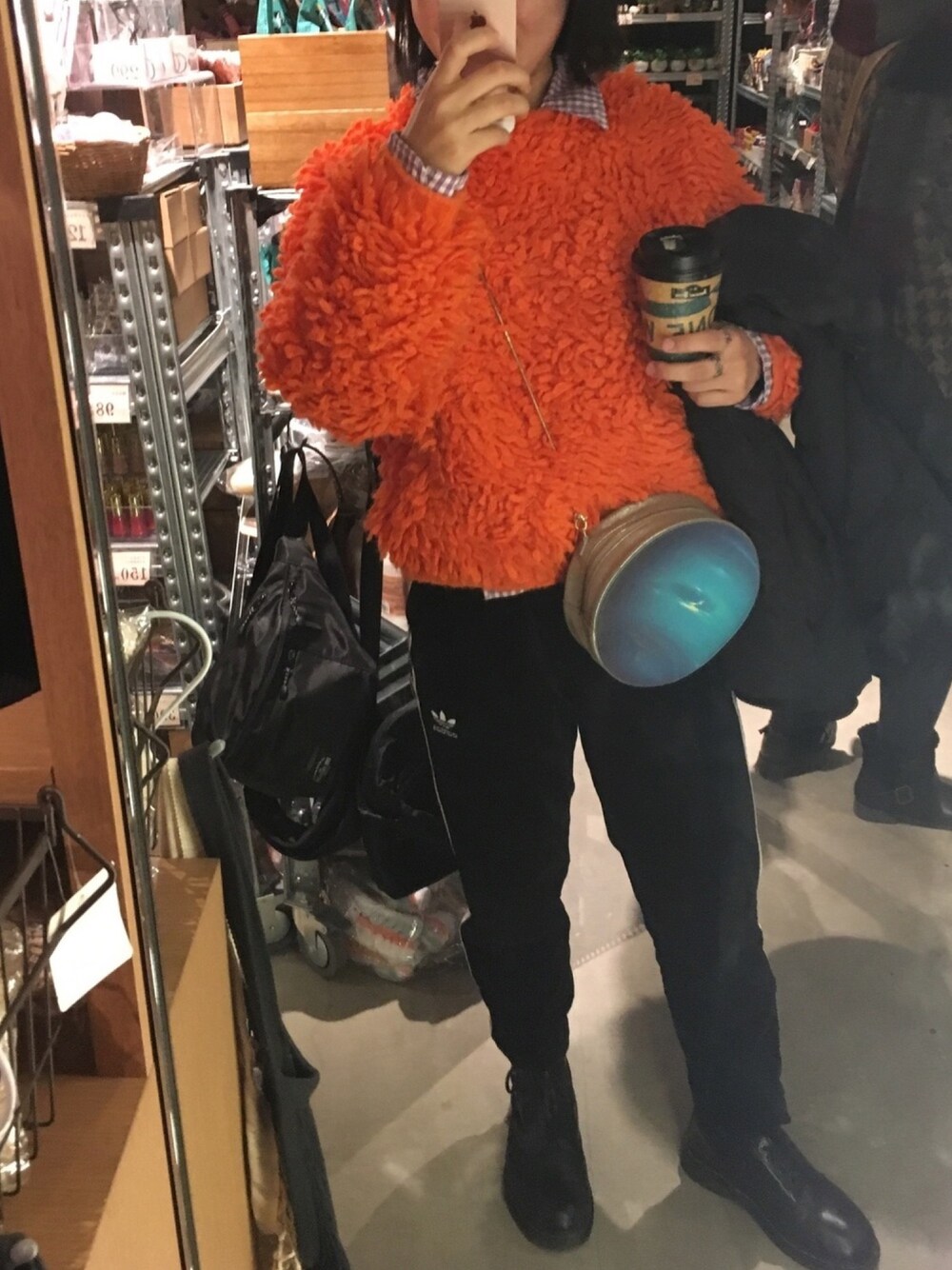 モップみたいなニットはお気に入りすごいあったかい adidasのパンツは古着でベロアっぽい生地