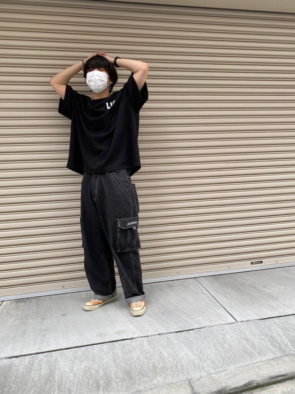 イエロー系のスニーカー、グレー系のパンツを着用したメンズの夏コーディネートの1枚目の写真