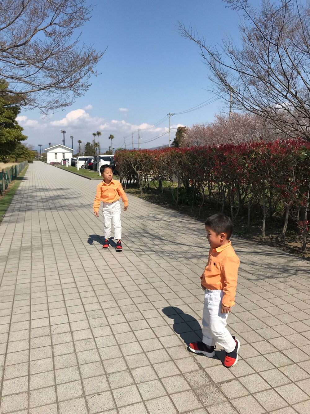 春らしいオレンジのシャツがポイント