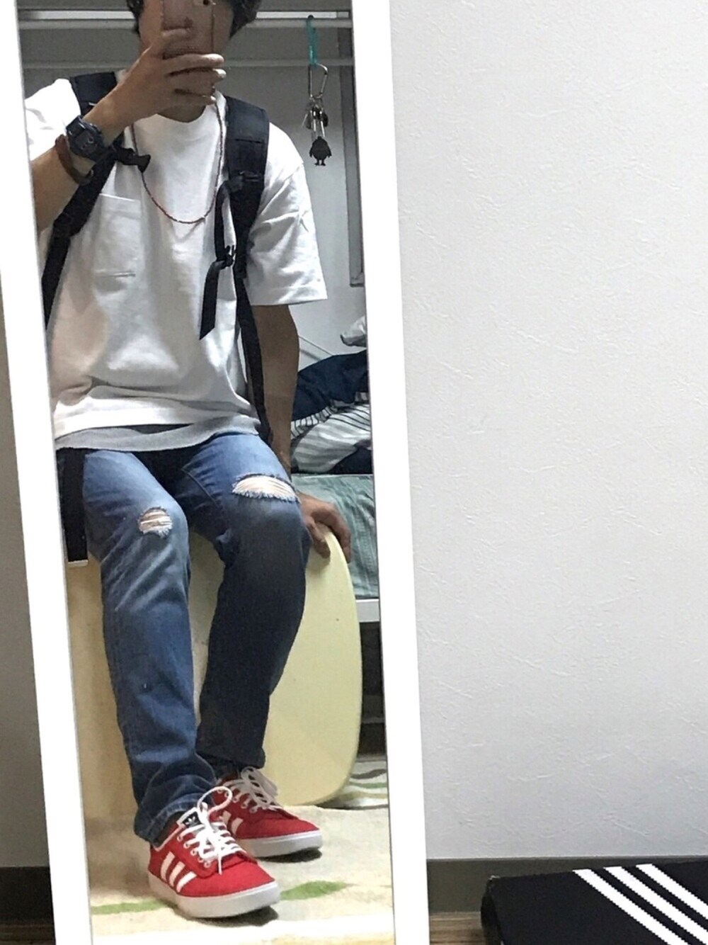 お久しぶりの投稿◎ 夏といえば白Tシャツ! 最近のお気に入りの赤スニーカー と合わせて全体的に明るくコーデ してみました◎