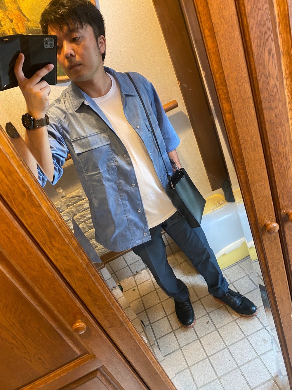 いつも閲覧ありがとうございます。 本日はタケオキクチのオープンカラーシャツ風なトップスからスタートです。 越谷アウトレットで見かけて気に入り購入したものでスウェード調の生地となってます。 着方としてはやはりインナーは白Tでしょう。 ボトムスはいつもの黒のGUドライストレッチにしようかと思いましたが無難過ぎると思い感動パンツのブルーをチョイス。 足元は安定のO-NINEのレースアップシューズでカジュアル寄りからドレス寄りに調整。 ドレス要素が足りない気がしたのでHAREのショルダーバッグをさして整えました。 感想 全体を薄目の青に揃えて白Tと季節感を意識できたかなと思います。 オープンカラーシャツのテロテロ感が少し苦手なんですがタケオキクチのこのトップスは少し肉厚なのとスウェード調の綺麗目な見た目で本来カジュアル要素が強いアイテムながら綺麗目要素を交えていき過ぎない程よい立ち位置が魅力で購入しました。 初めてコーデを組みましたが少し間違えると幼さが出てしまいそうなデザインがヒヤヒヤしましたがなんとか組めたと思います。 エアリズムコットンクルーネックTはインナーに着るには着回しがよく汗をかく夏にはやはり汗を乾かしやすい、かいたとしても匂いを抑えやすいメリットも相まって使いやすさ抜群です。 参考になった方よろしければいいね、お気に入り、フォローしていただけるとモチベーションがあがるのでよろしくお願いします。