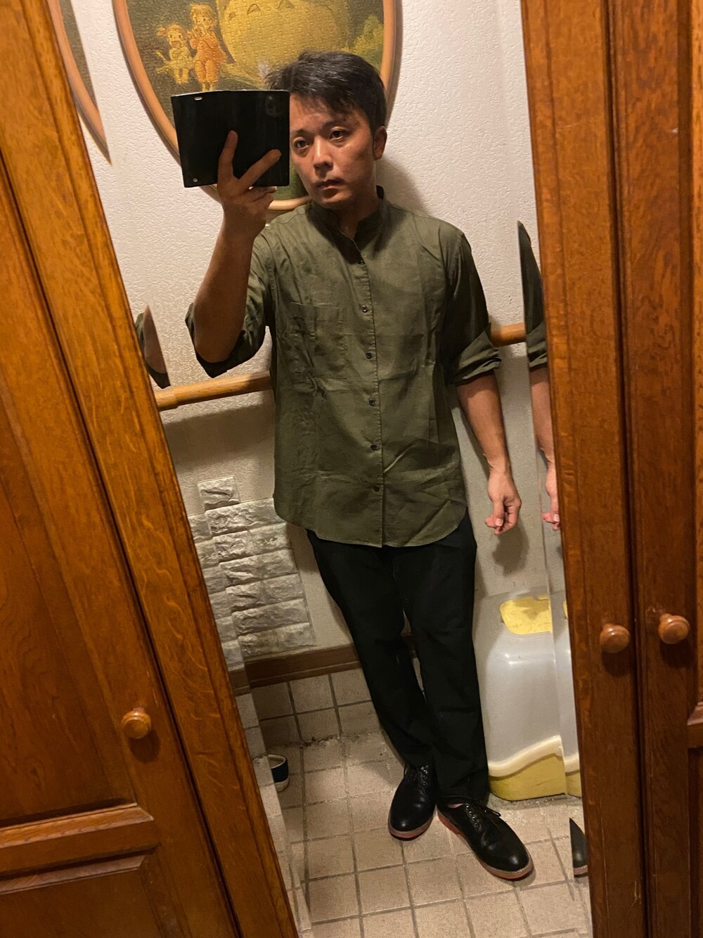 いつも閲覧ありがとうございます。 本日はGUのリネンブレンドスタンドカラーシャツからスタートです。 オリーブのシャツなのでカジュアル寄りですからボトムスはドレス寄りにスラックス形をチョイス。 夏場に安定のGUドライイージーアンクルトラウザーは残暑も秋雨も活躍しそうです。 シャツがリネンブレンドで薄いのでインナーに黒のタンクトップをさしましたが前をオープンすると野性味が強くなりすぎるのであえて見せずに着こなしました。 ちくすけを防ぐ意味と暑過ぎた場合後で前をオープンにしても良いように着てみました。 シューズはドレス寄りにしてO-NINEのレースアップシューズをチョイスで完成です。 感想 夜からのお出かけでしたのでスタンドカラーシャツの長袖を腕まくりの前閉めで着ましたが日中はオープンしないと厳しそうですね。 ただリネンシャツで薄くて涼しげなので雨の日や残暑の日くらいなら行けそう。 前を開けるならタックインしてベルトをして半分あける着こなしもいいんじゃないでしょうか? スタンドカラーシャツが着てみた感じかなり良いです。 夏場は半袖を選びがちですが長袖腕まくりが自分は大人っぽく着こなせるので好きです。 参考になった方いらっしゃいましたらいいね、お気に入り、フォローしていただけるとモチベーション上がるのでよろしくお願いします。