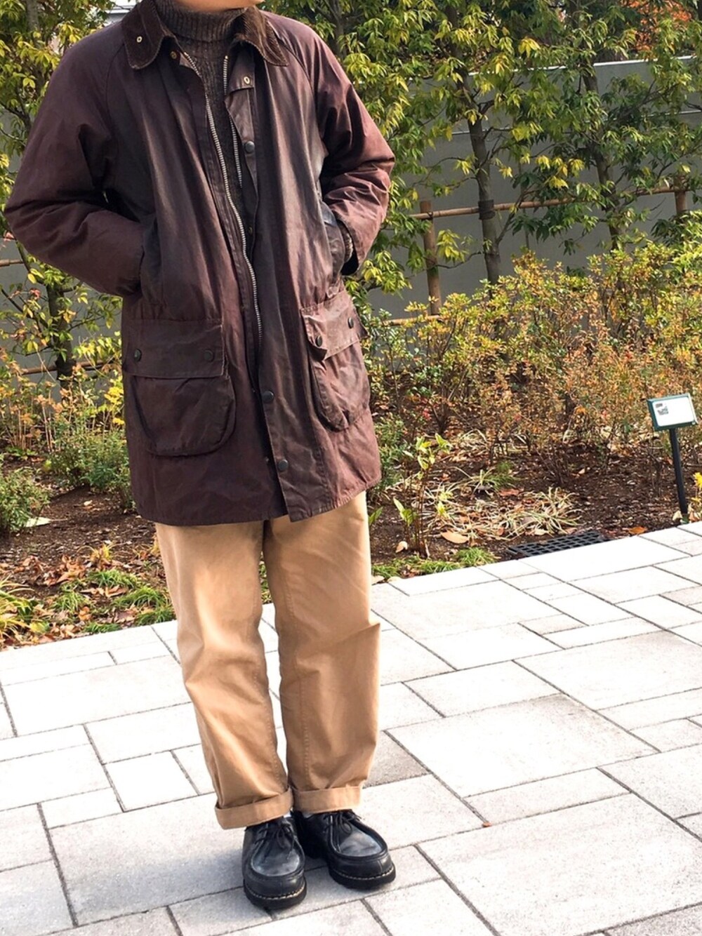 ビンテージのバブアー。GAMEFAIRは丈感が絶妙でよいです。秋冬っぽい色感を演出。12℃まだいける