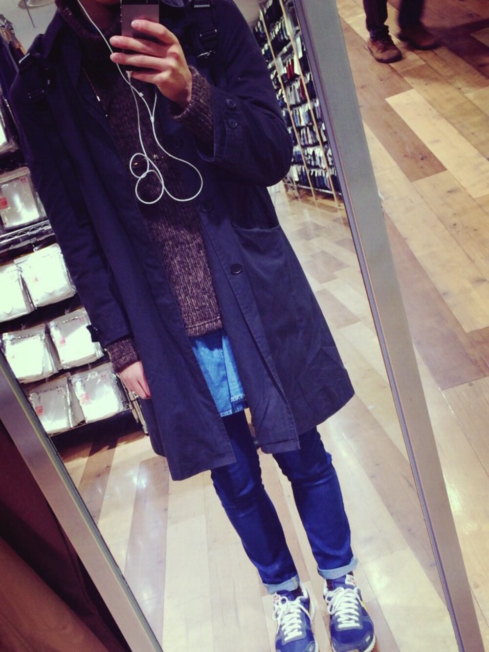 今日のコーデです デニムのロングシャツにタートルネック デニムスキニーとNikeスニーカー コートはBurberryです