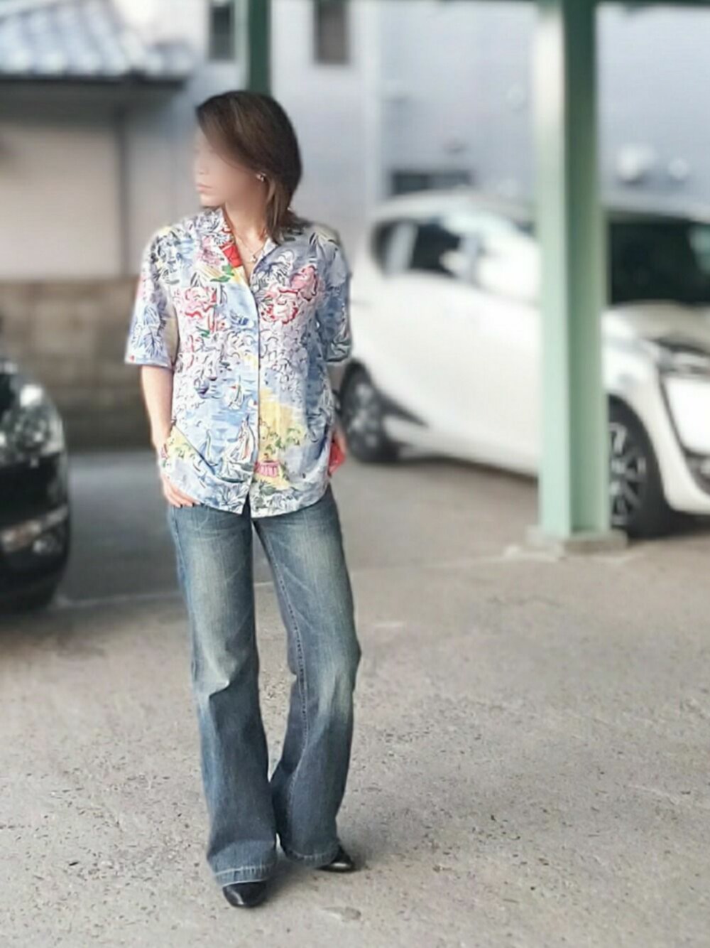 アロハ×ワイドなフレアデニム☻ メンズライクをヒールで綺麗にカッコよく着る 着れた? こんな感じも久しぶり 前回もフォルダありがとうデス☻感謝デス☻