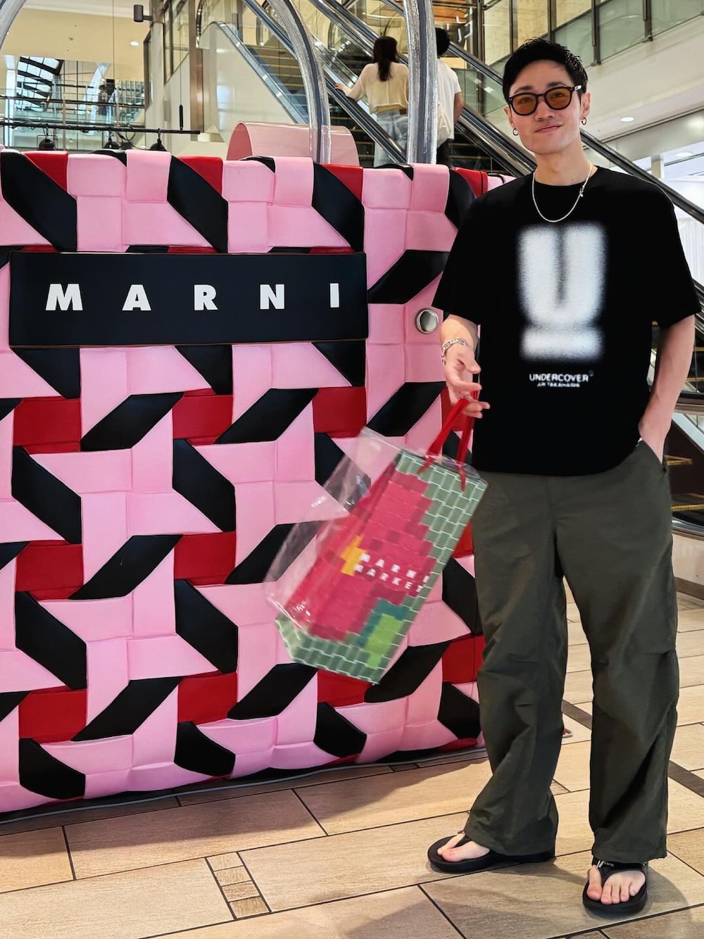 名古屋ラシックのマルニマーケットにて📷 undercoverのTシャツは今夏のお気に入りです👍 numbernineのカーゴパンツと合わせて男っぽい印象に👨 足元はoofos×undercoverです🌻 リカバリーサンダル楽すぎて重宝してます😌