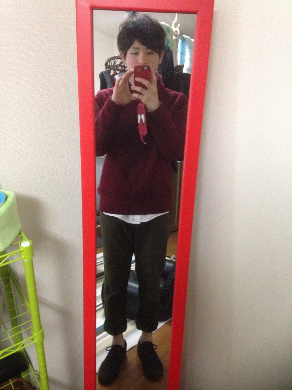 ワインレッドにセーターお気に入りです!! 襟の部分が太くてかっこいい(>_<) 靴はもしかしたらレザーがいいのかも^_^;