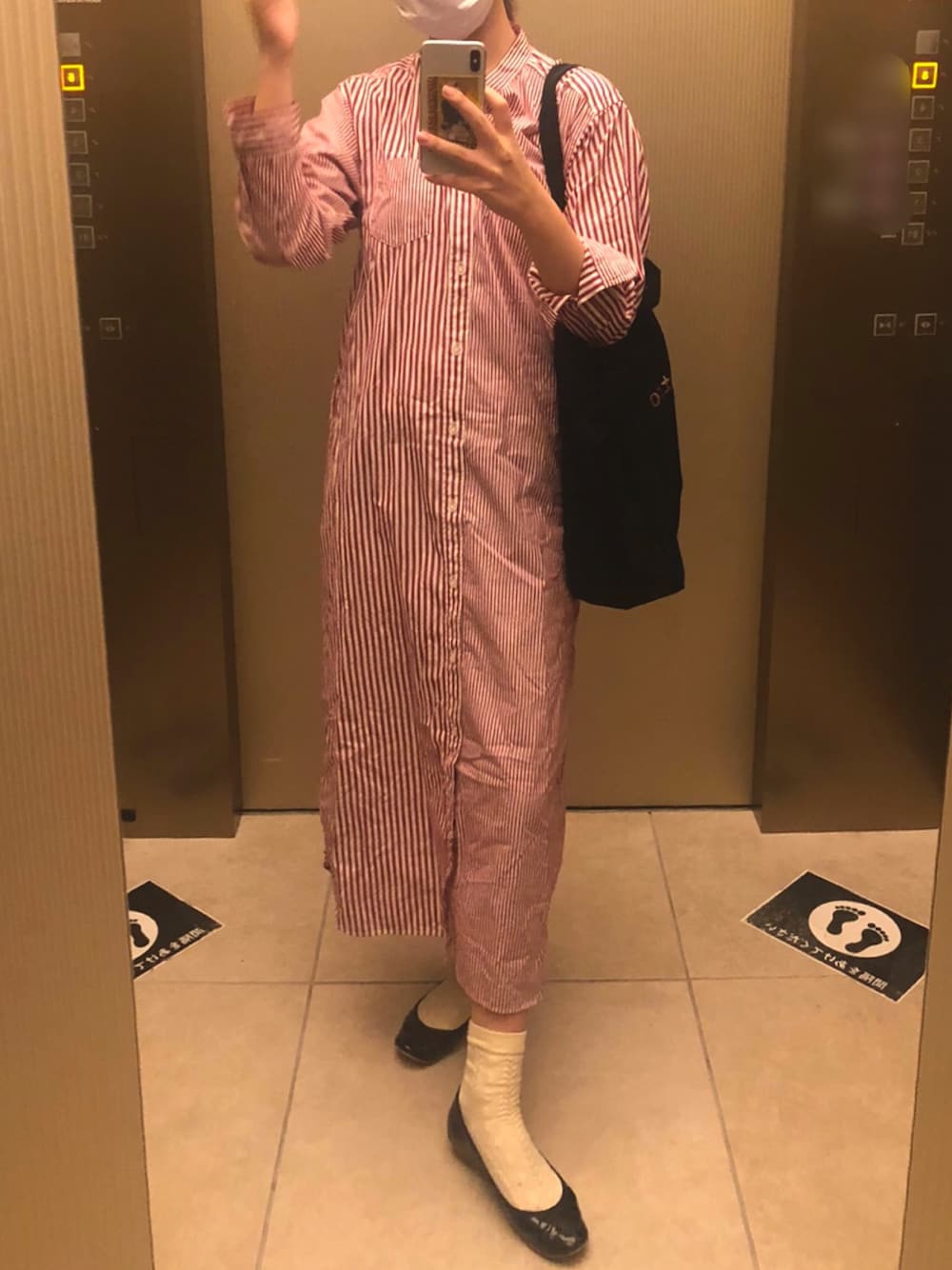 ちょいとシワだらけだけど、、 ボタンを境にストライプの幅が違うのです!去年購入したやつです😉 色味は、赤よりも深い明るくで、燕脂っぽいかも! レペットのバッグはめちゃでかいからとりあえず何でもぶちこめます