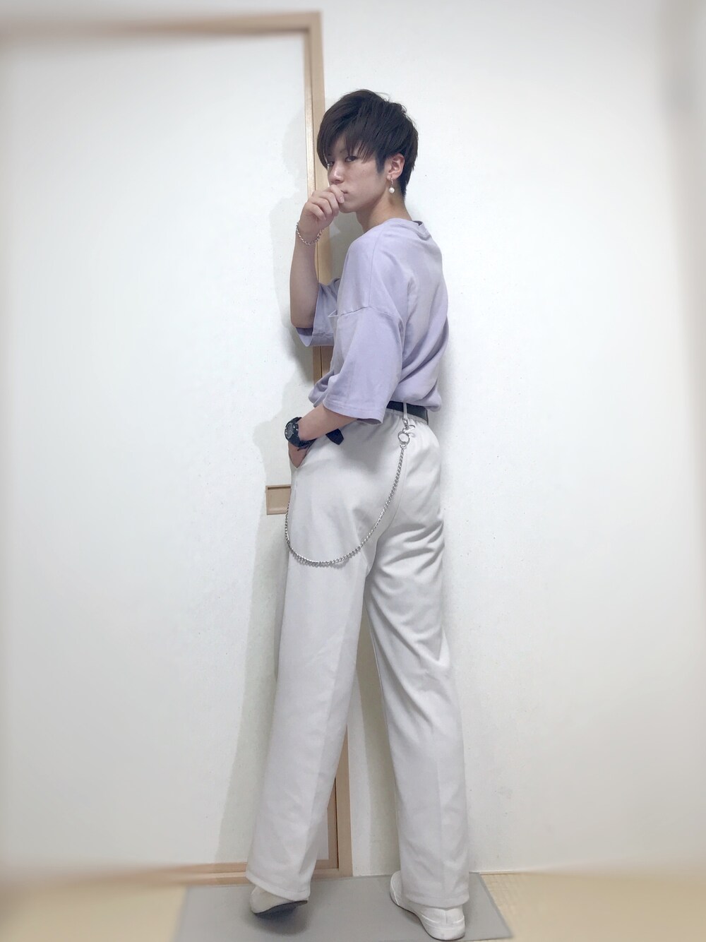 【私服コーデ】 いつも見てくださりありがとうございます!😊 今回は、大人っぽさを意識したタックインコーデになってます!! パープルの色彩で上品さと色気のあるスタイルに演出できます!!😁 タックインを1 : 2 のバランスにすることで脚を長く見せつつ、腰元で遊ばせることも可能です!!😆😆 ☆ポイント 夏のタックインコーデ!!腰元で遊ばしつつ、パープルの色彩で上品さを!夏こそ、爽やか且つエレガントに!!😉 白パンツ×白スニーカーでより脚を長く見せることができます!!👍👍 トレンドの白パンツですが、センタープレスが入ってることで、夏でも綺麗めにすることが可能です!!✌️ ペールトーンの中でも寒色系はより爽やかで、パープルはエレガントさを象徴できるので是非試してみて下さい!!🤞