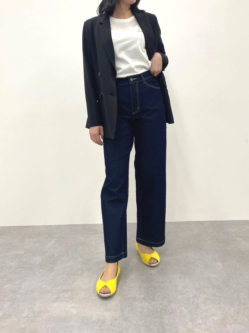 カジュアルなコーデにジャケットを合わせてカジュアルすぎないコーデに。アクセントにイエローカラーのオープントゥパンプスで遊び心ある雰囲気に。