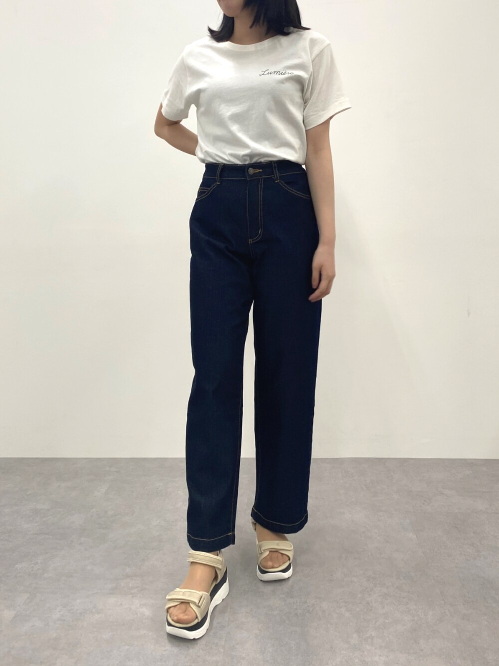 Tシャツとデニムの定番の合わせに、スニーカーサンダルでさらに夏らしさをプラスしました。