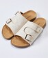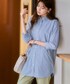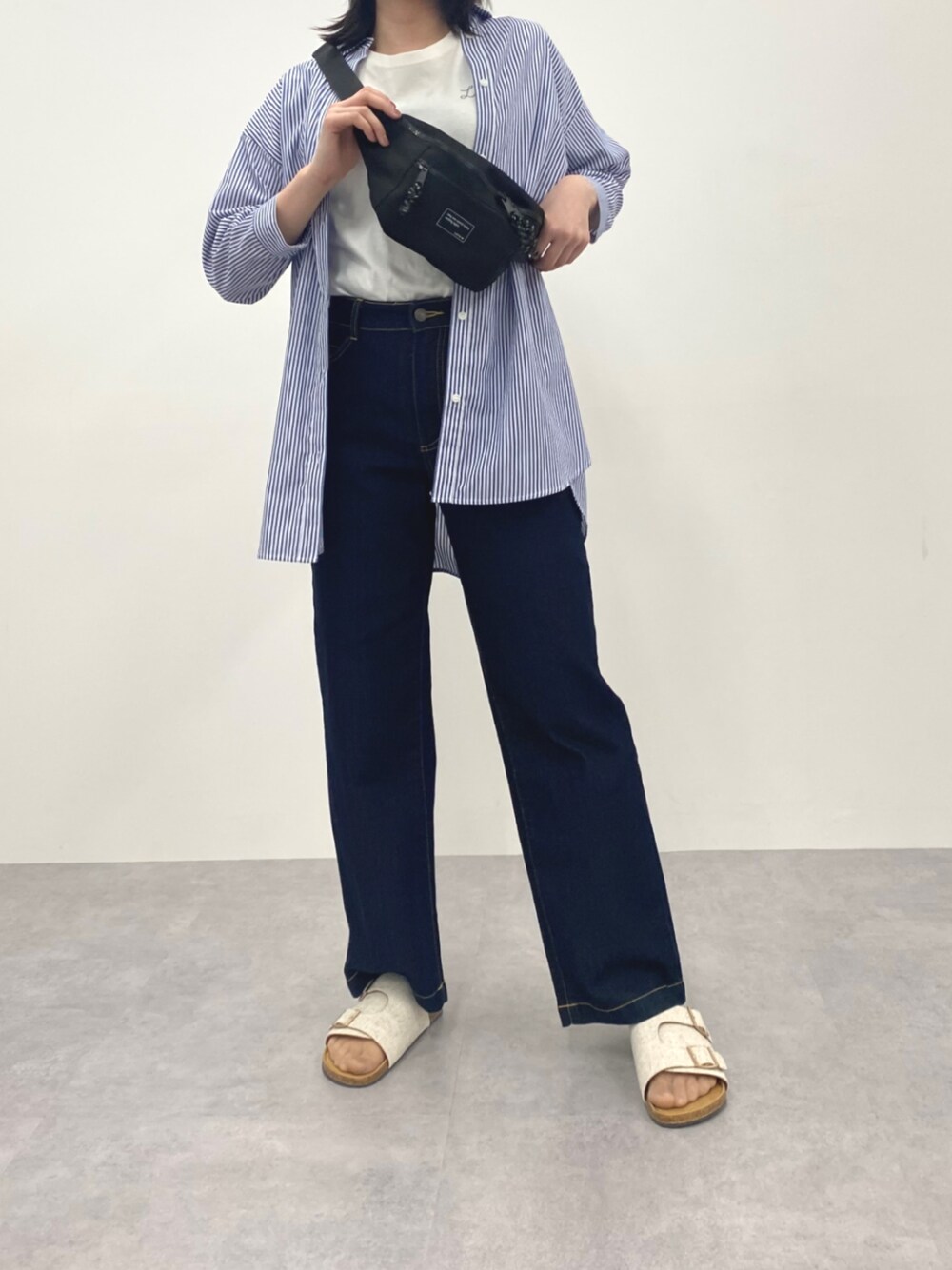 ストライプシャツとダブルベルトデザインのサンダルがポイントのコーデです。