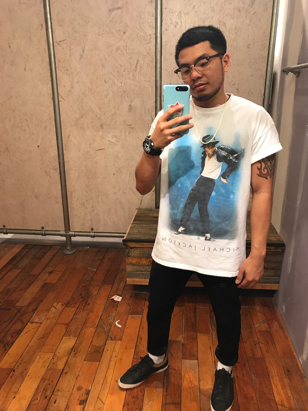 Tribute To The King Vintage Michael Jackson Tee BDG Black Denim Jeans Huf Socks Aldo Casual Sneakers