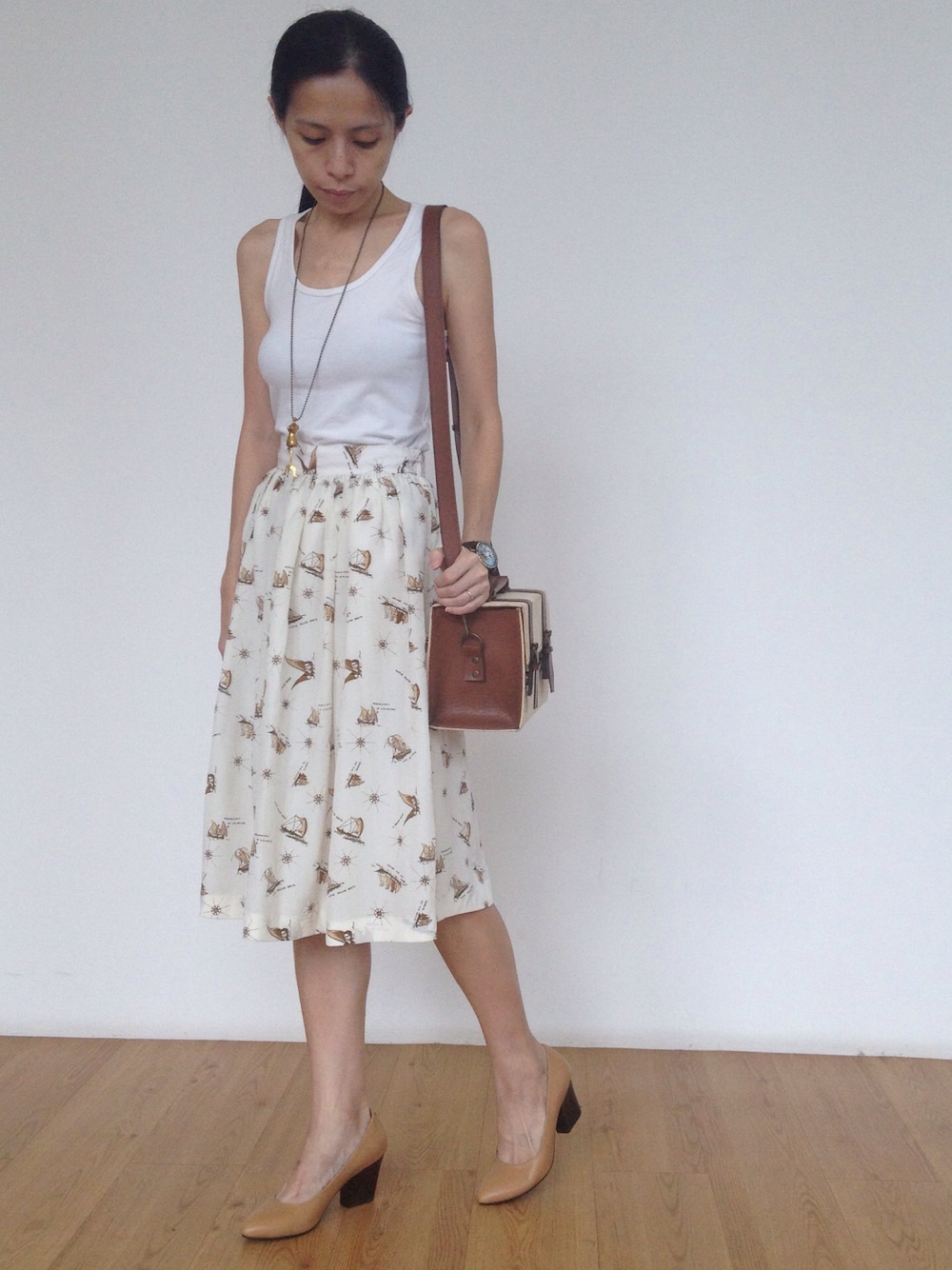Adore my nautical print midi skirt? This is super high waist..fits a 23"..hardly fits me but I'm determined to work it today ^^ Makeup less coz it was a long day yesterday. Feeling drained sort of. And the pillbox bag is rather cool huh. Thrifted again.