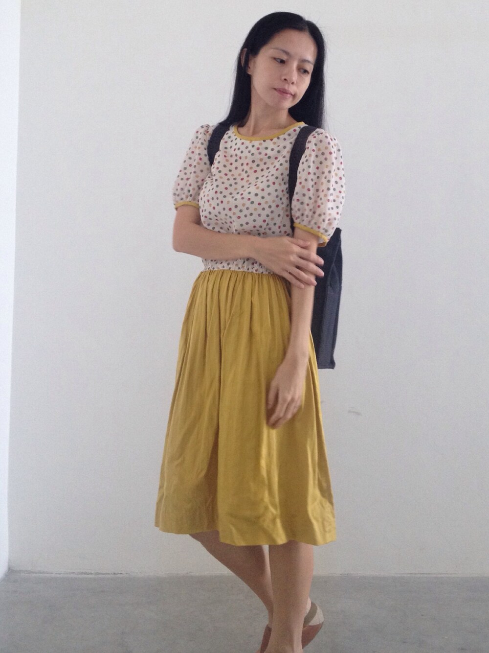I so adore this one piece mustard dress to bits simply becoz it features colourful polka dots above waist and finishes with embossed emblems at the flare..a rare beauty I cannot stop admiring.