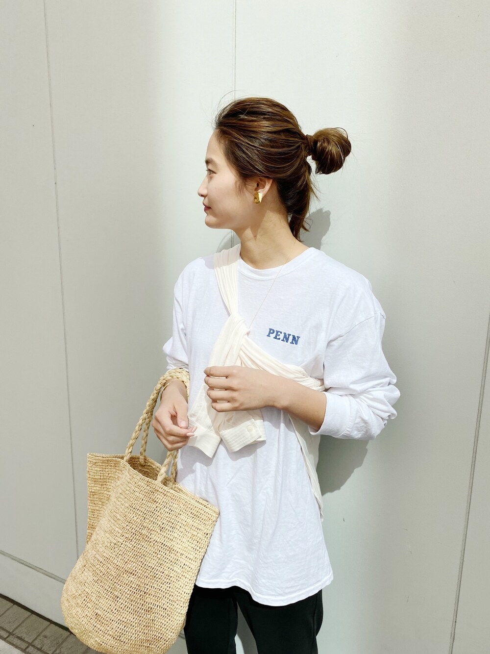 ロゴティーは カジュアルな雰囲気に仕上がるので 艶感のあるブラウスやカゴバックなど 女性らしいアイテムを足してあげるのがおすすめです^^