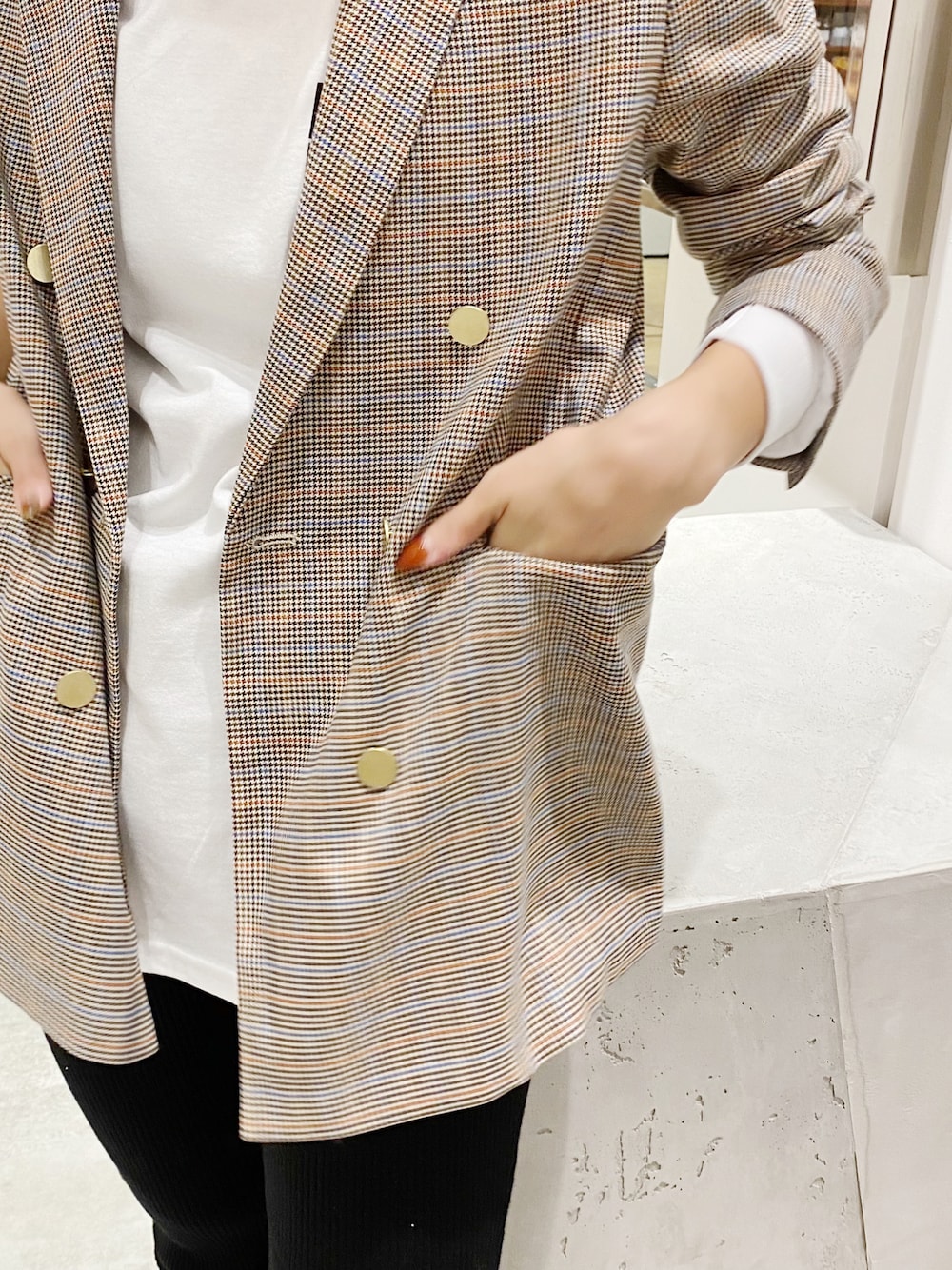 今季入荷したダブルジャケットは チェックのカラーが強すぎず ナチュラルに決まる一枚です^^ ゴールドのマットなボタンは 綺麗めすぎない印象にしてくれる 大事なお洒落ポイント!! 少しラフなサイズ感で 袖も長さがあるため 腕をまくり、 くしゅっとこなれ感を出すのも◎