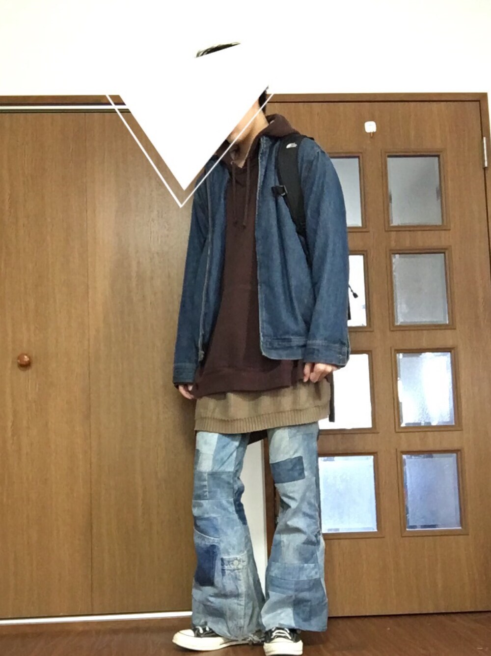 ブルー系のパンツ、ブラック系のスニーカーを着用したメンズの秋コーディネートの1枚目の写真