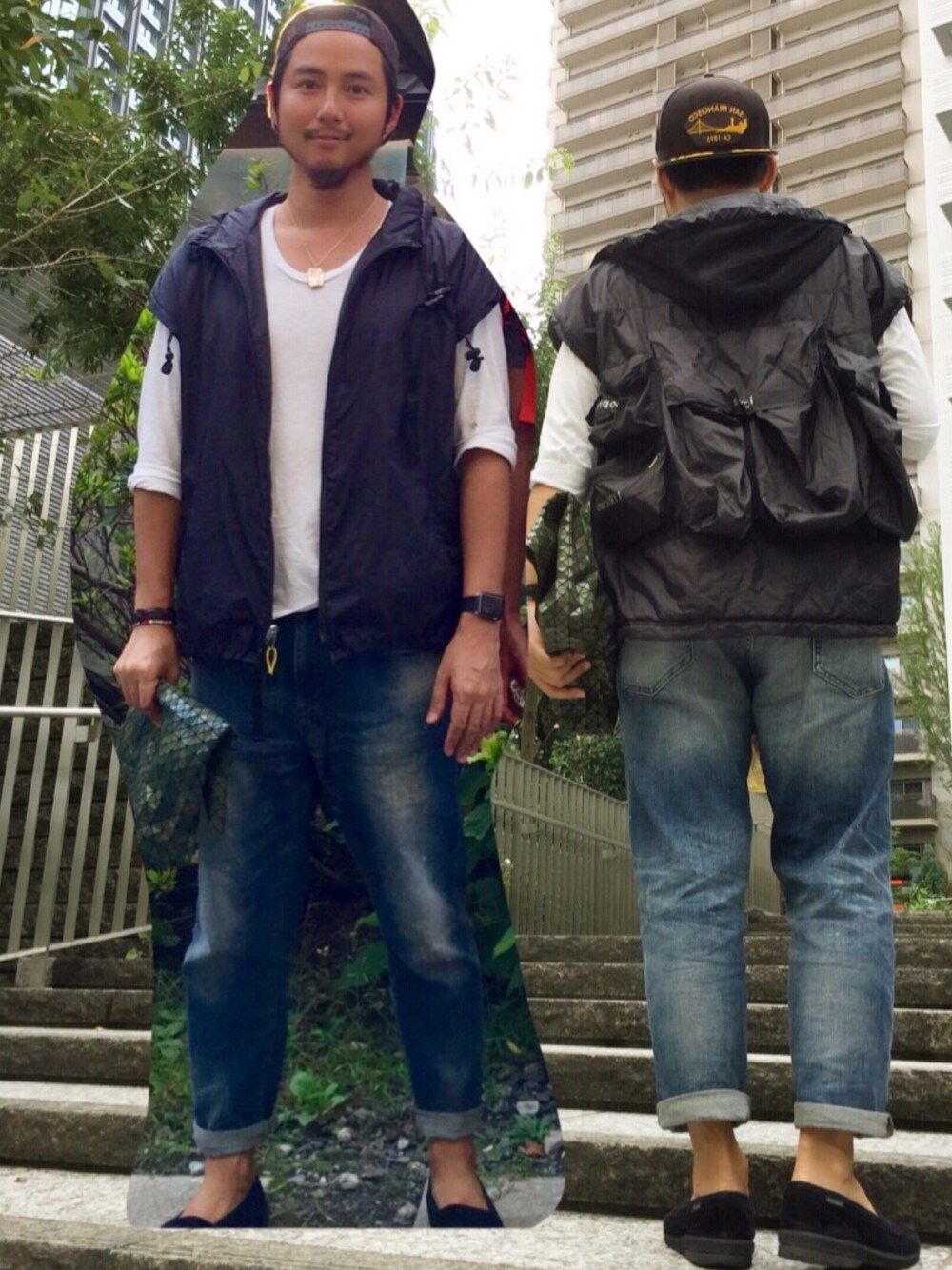 無理やりですが、前後を張り合わせて1枚の画像にしたものです。後ろ姿が特徴のナイロンベストを着ていたので。収納ポケットが後ろにたくさんついてるナイロンベストですが薄い素材なので中にモノを入れると形が崩れそうで何も入れられずです。