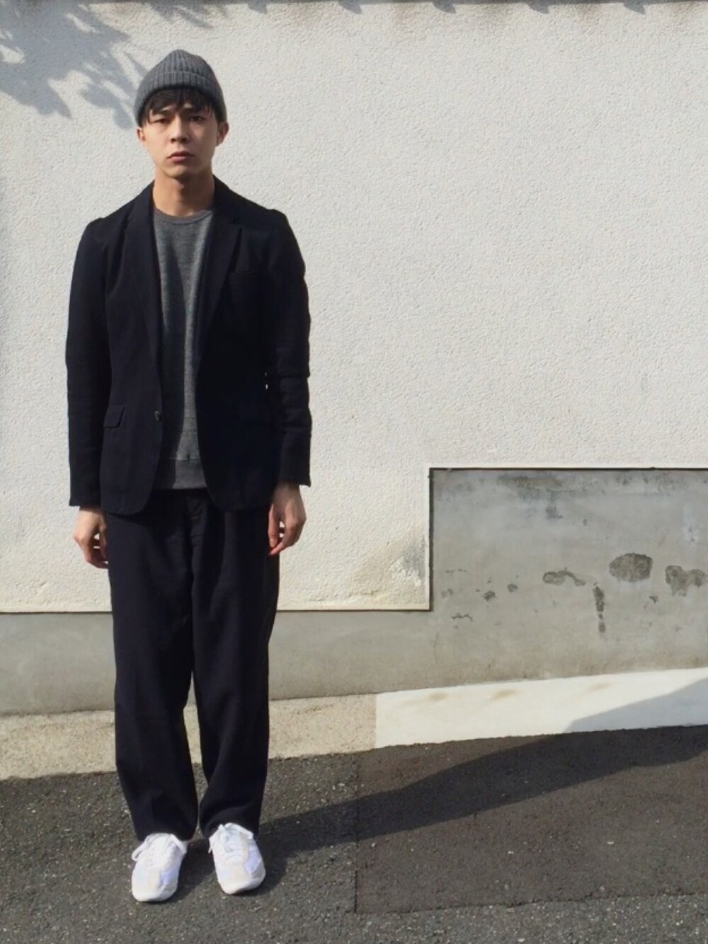 こんばんは。 ジャケットとスラックスでセットアップ風に、 ニットキャップと、スニーカーでカジュアルにしました。