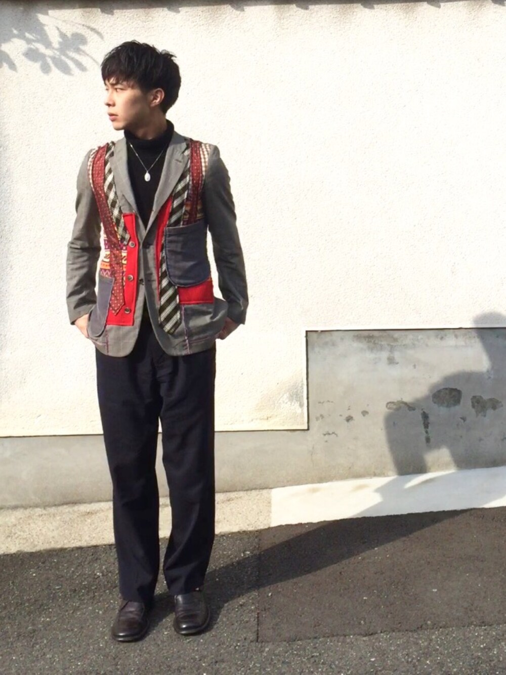 こんにちは〜! 今日は成人の日ですねー 二十歳のみなさん、成人おめでとうございます!! それにしても、自分が成人したのがもう2年前だと思うと、本当に早いな〜って思います(笑) 今日はとっておきのジャケットを…! 古着のオムプリュスなのですが、前身頃にヴィンテージのネクタイを貼り付けてあります。 あまり外に着ていくことはない、ほぼコレクション状態のものです。笑