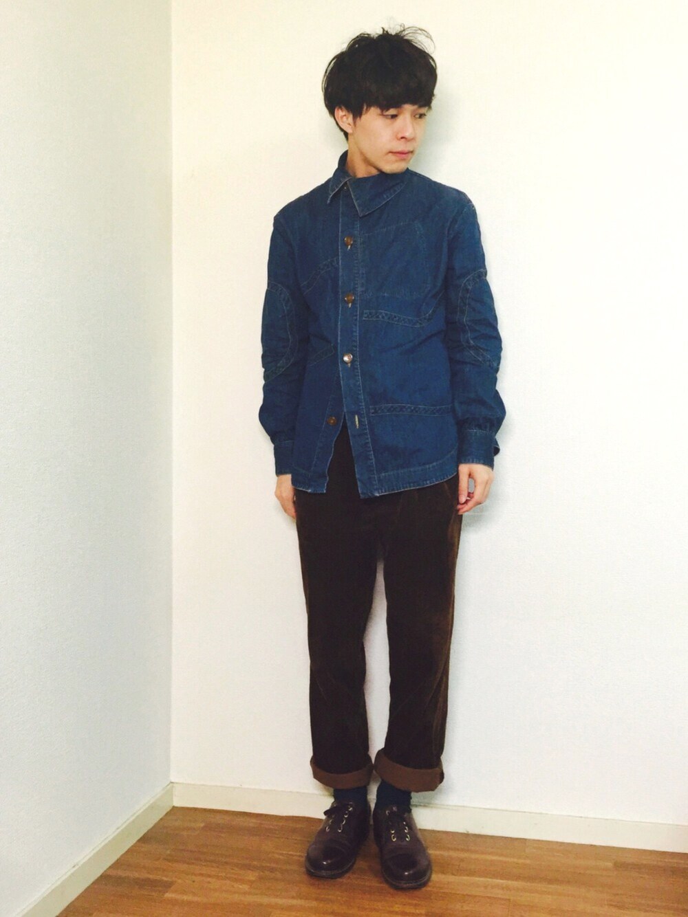 こんばんは! 今日は寒かったですね! というわけで、コーデュロイ解禁しました! コーデュロイは断然畝の大きいいかにも古着といったものが好きです。 これはusedのBENETTONのものですが、イタリア製で今では珍しいんじゃないかなと。 トップスはなにを持ってこようかなぁと悩んだのですが、お気に入りのvivienne westwood manのデニムジャケットにしました。 このブランドはかなり派手でパリッとしたイメージがあるのですが、このジャケットは形やディティールは奇抜ながらも色味が落ち着いているため、ワークスタイルにもハマります。