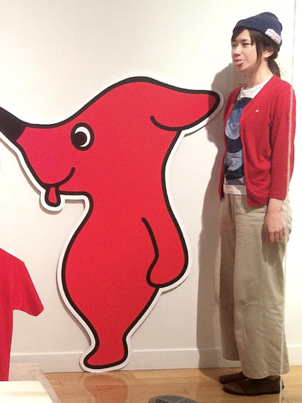 Suicaペンギン 生みの親 絵本作家のさかざきちはる展にて。 チーバくんと同じ舌出しポーズで。 Tops:mina perhonen T-Shirts:JETLINK Bottoms:YAECA Boots:Loint's