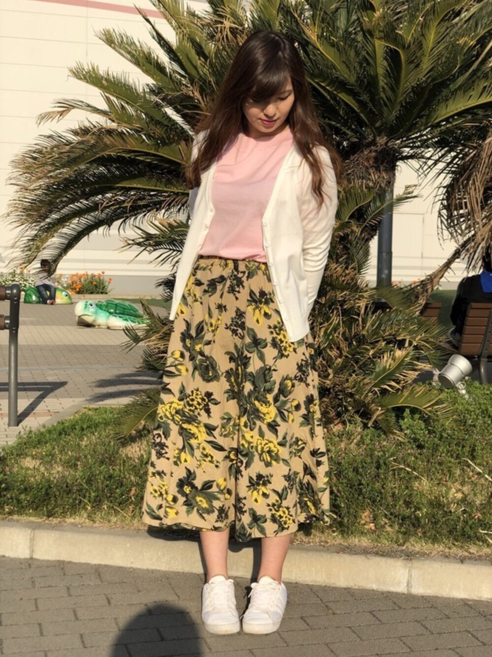 花柄スカートとショート丈の白カーディガンを合わせて春色一色の可愛いスタイルに! カーディガンとスニーカーの色を合わせることで全体を統一、中には女性らしい春ピンクを合わせました。デートや女子会にしていきたいコーデです。