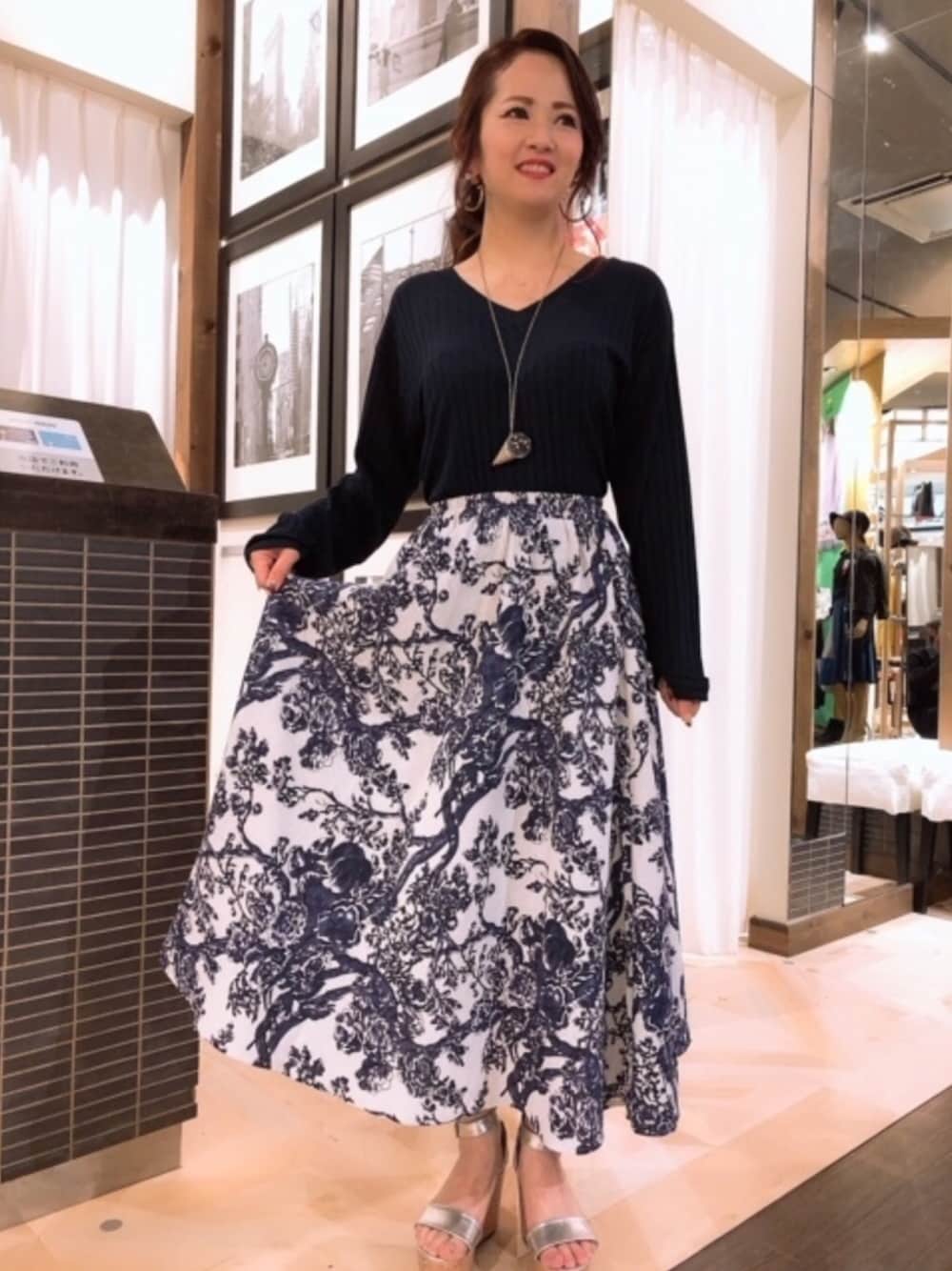 華やかなスカートを履いてリゾート気分に♪ ウエストはゴムの為とても楽に履くことができます。タックがあることによりお腹回りもスッキリみえ広がりも気にならずストンとしているので全体が細く見えるのが嬉しいですよね。足元はサンダルだけではなく、スニーカーを合わせてもカジュアルさが増して、ゆるコーデの完成です。