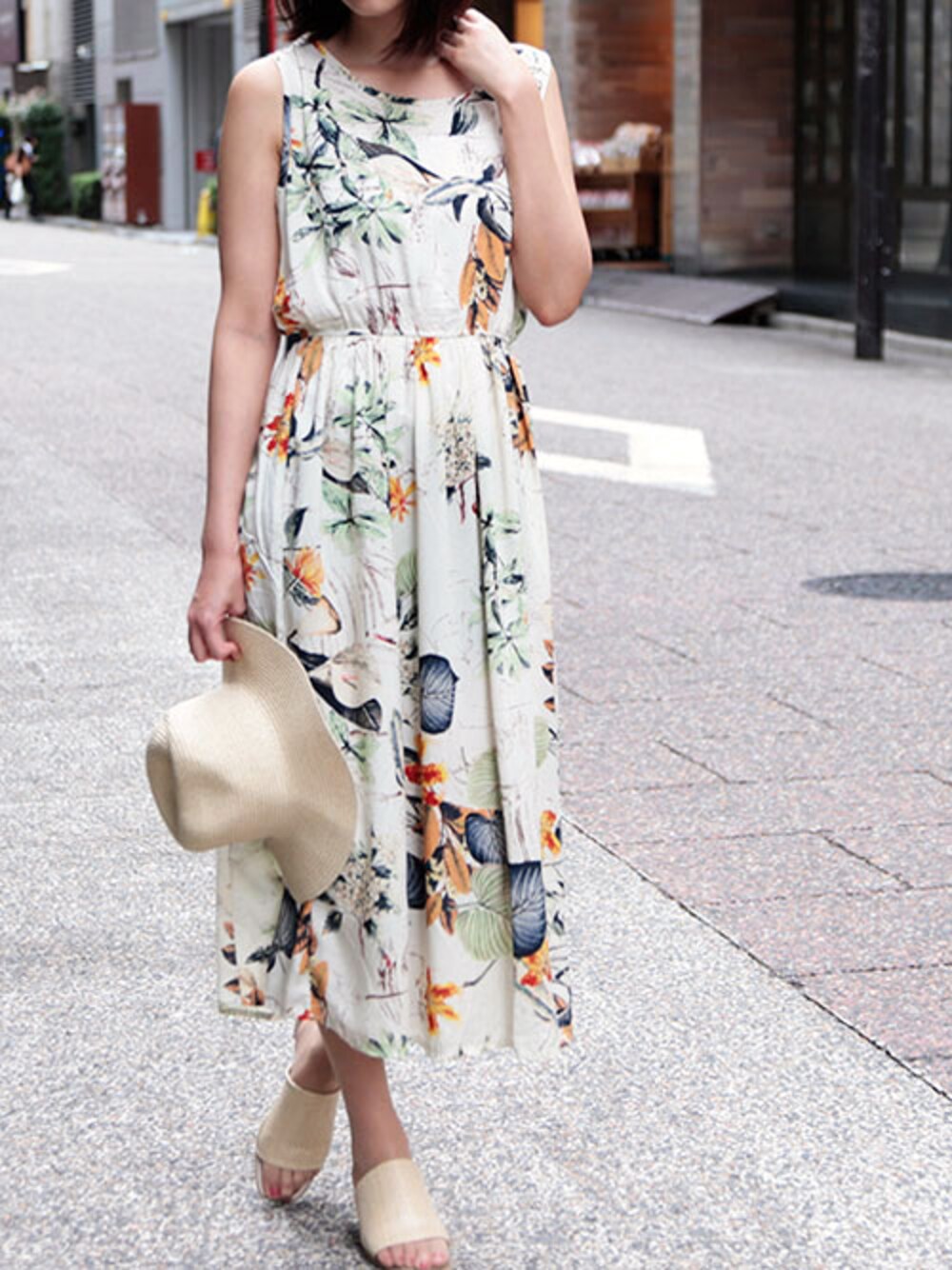 落ち着いた色味だから街で着ても馴染んでくれるリゾート風ワンピース。 帽子と合わせて大人コーデに。 暑い夏はノースリーブワンピースが大活躍♪