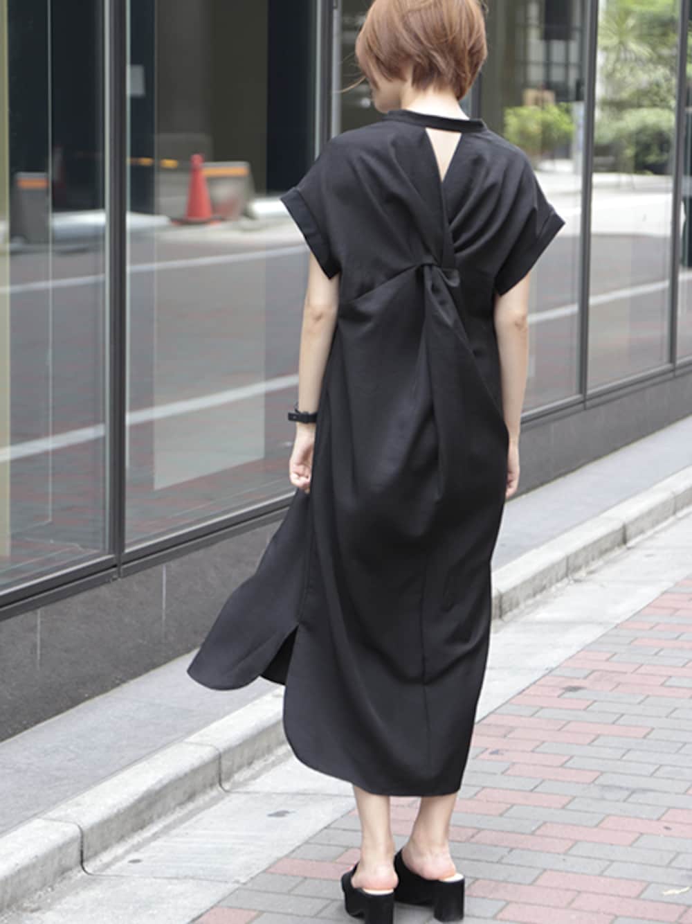 バックスタイルがとってもお洒落♪ 上品な大人風のツイストデザインが◎ シャツワンピースはシンプルになりがちだけど、これなら一枚でばっちり決まる!