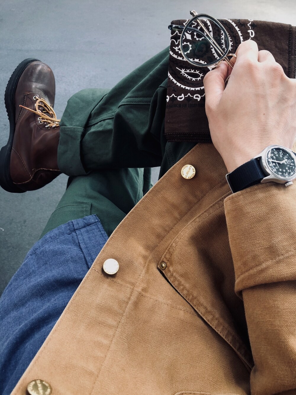 coverall Carhartt shirt Porter Classic inner UNIQLO pants ENGINEERED GARMENTS WORKADAY belt BAGJACK socks L.L.Bean boots RED WING eyewear OLIVER PEOPLES watch TIMEX bandana HAV-A-HANK ☀️☀️☁️