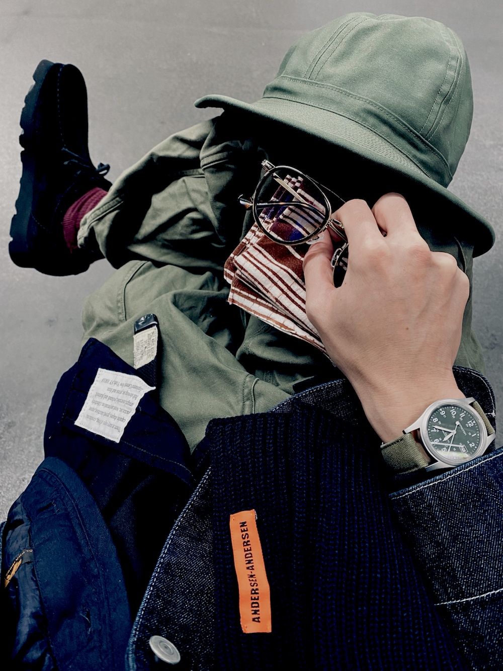 coverall UNIVERSAL PRODUCTS liner jacket Alpha Industries shirt ENGINEERED GARMENTS heat tech ALEXANDER WANG×UNIQLO innerwear Champion cargopants Nigel Cabourn belt PORTER×N.HOOLYWOOD socks American Apparel shoes Clarks hat BEAMS PLUS eyewear VIKTOR & ROLF watch HAMILTON tenugui ANATOMICA muffler ANDERSEN-ANDERSEN 😷🥸🥶🍀💙💚🧔🏻💈💇♂️🚶♂️