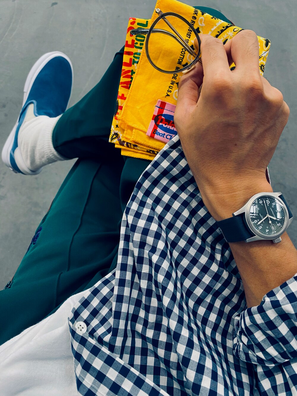 shirt PORTER CLASSIC t-shirt CUP AND CONE innerwear UNIQLO pants NEEDLES×Sasquatchfabrix. socks TCK shoes VANS × SSZ × BEAMS PLUS eyewear OLIVER PEOPLES watch HAMILTON bandanna MIN-NANO 🌥️🥸🧊🍏🦋🦁🍋💥⚡️