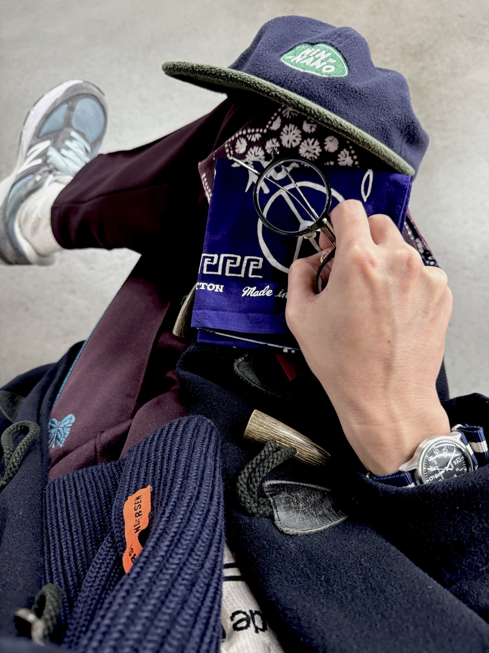 duffle coat COMME des GARCONS HOMME sweat DRIES VAN NOTEN mockneck tee FreshService heat tech ALEXANDER WANG×UNIQLO inner wear UNIQLO pants Needles socks American Apparel shoes New Balance cap CUP AND CONE×MIN-NANO eyewear JINS watch TIMEX bandanna NEPENTHES×〈OTAKARA NYC〉 tenugui Needles muffler ANDERSEN-ANDERSEN ☁️🥸💙🐘💨🍇🦋🦋💰✨🪻🥀🪷💫