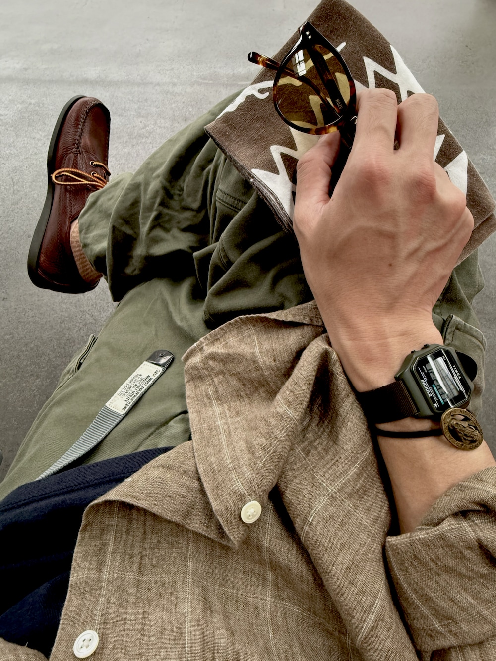 shirt PORTER CLASSIC pack tee FreshService innerwear UNIQLO cargopants Nigel Cabourn belt PORTER×N.HOOLYWOOD socks HIDDEN shoes G.H.BASS×District eyewear THINGLASS watch TIMEX×BEAMS tenugui South2 West8 hair accessory WACKOMARIA ☂️😎🍫🥑🍀🍊🥭🍔🔥🔥⚡️⚡️