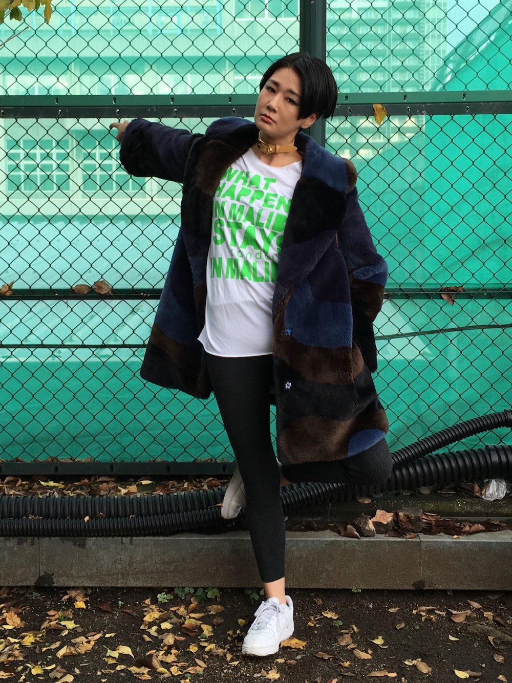 オーバーサイズのフェイクファーコートでグラムロックっぽく