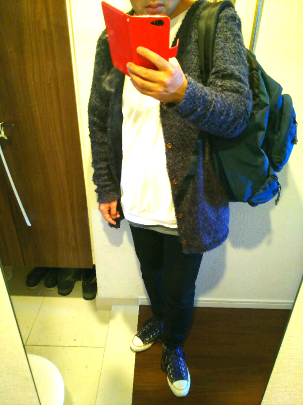 おはようございます。 viewありがとうございます。 今日も寒いです。 コーディガンを羽織ってみました。 インナーにビッグT。 ボトムスはスキニーデニム。 足元はコンバース、オールスターHiです。 それでは、良い休日を♪