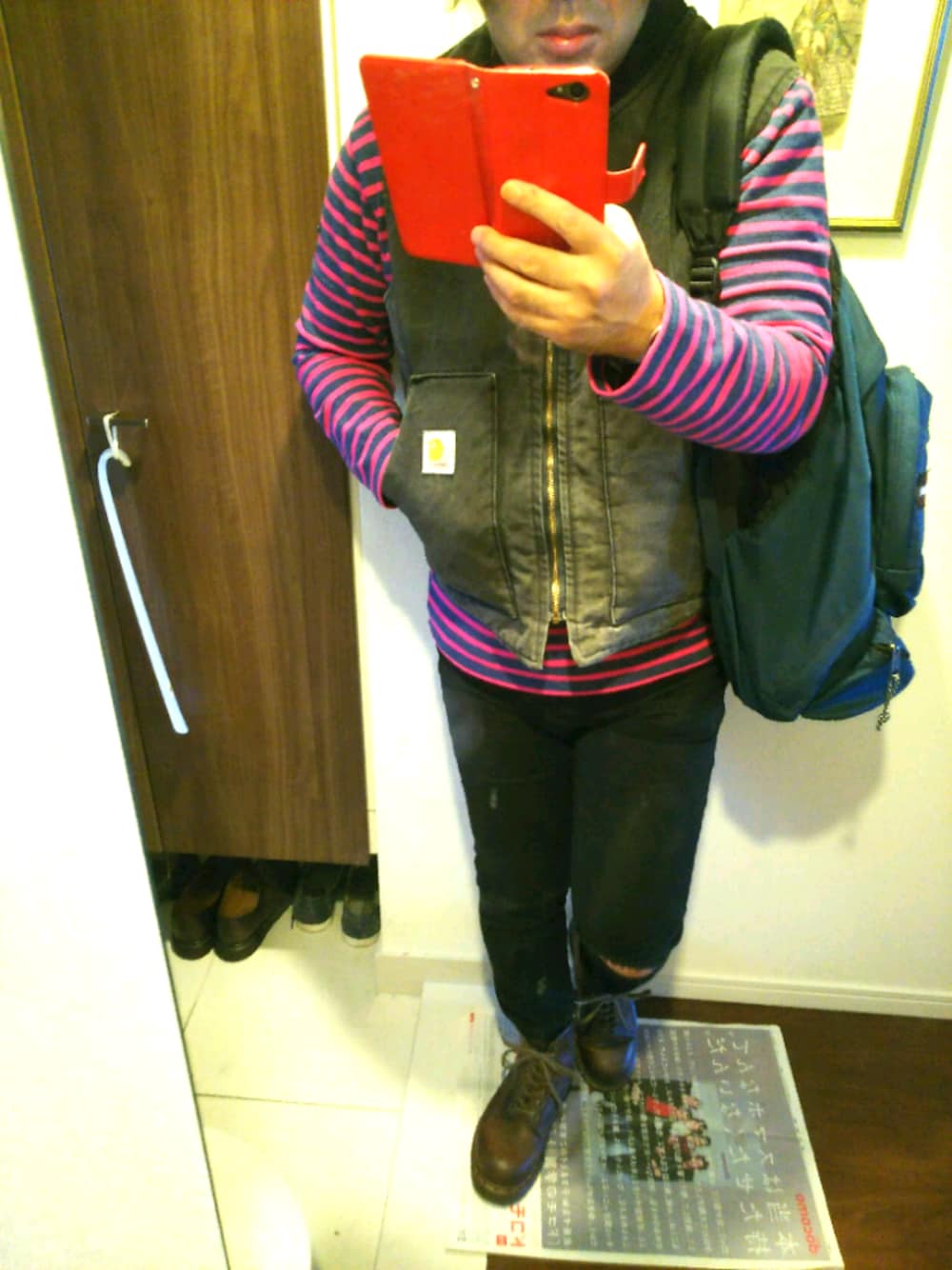 おはようございます。 viewありがとうございます。 今日はアウターにカーハートのダウンベスト、インナーに、ピカソが愛用したセントジェームス、ウェッソンです。 ボトムスにクラッシュスキニー。 足元は永遠の労働者のワークブーツ、マーチン、8ホールです。 それではよい休日を♪